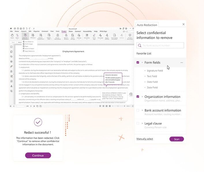 Smart Redact provides a simple, easy, efficient, and comprehensive method to assist people in dealing with sensitive information from the (PDF) documents. It helps users who need to redact sensitive information in PDF but don’t know the exact words to redact in advance. With Smart Redact, the users don’t have to read through every page to find sensitive information in each sentence. Instead, Smart Redact lists all sensitive data in PDF files in seconds with a single click. For users with a large-volume of documents to redact, the Batch Redact function allows users to redact multiple documents at the same time.